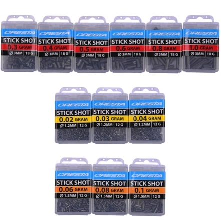 Deze Cresta Stickshots helpen je bij het eenvoudig uitloden van elk dobber. Dankzij de aanduiding in gewicht i.p.v. van nummers is het selecteren van het juiste loodje zeer eenvoudig. De juiste zachtheid en de perfect gecentreerde snede zorgen ervoor dat Stickshots gemakkelijk op zowel dunne als dikkere lijnen te fixeren zijn , zonder dat deze hierdoor beschadigen. De langwerpige vorm zorgt voor extra grip op de lijn, waardoor ze tijdens het vissen niet of nauwelijks verschuiven. De slanke vorm zorgt voor een geleidelijke en zeer natuurlijke manier van afzinken. Dit alles maakt Stickshots zeer geschikt voor de traditionele visserij op witvis en de karpervisserij op commercials. Stickshots zijn verkrijgbaar in 16 verschillende maten van 0,02 t/m 1,0gr, zodat altijd een optimale loodzetting bereikt kan worden.